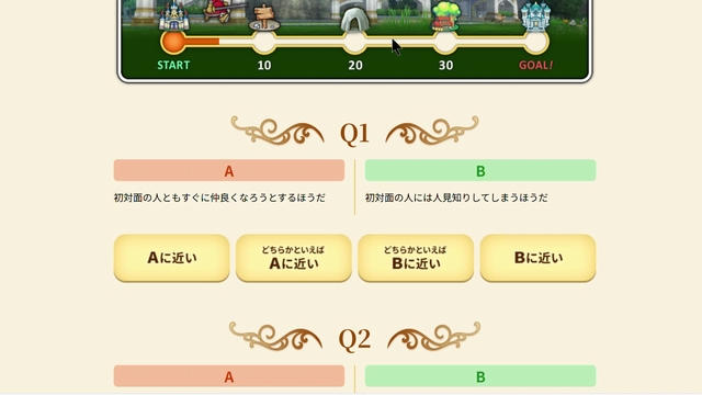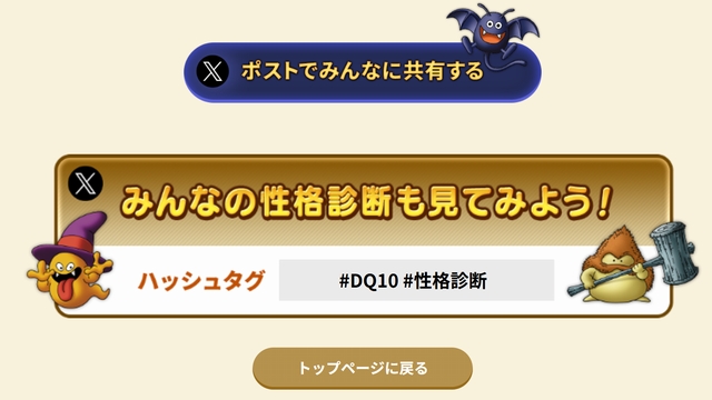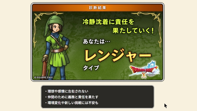 本性格診断の回答結果は、個人を特定しない統計データとして「株式会社 リクルートマネジメントソリューションズ」に提供し、『ドラゴンクエストX オンライン』のサービス向上、提供先の製品やサービスの開発・改善および販促活動等 に活用させていただきます。